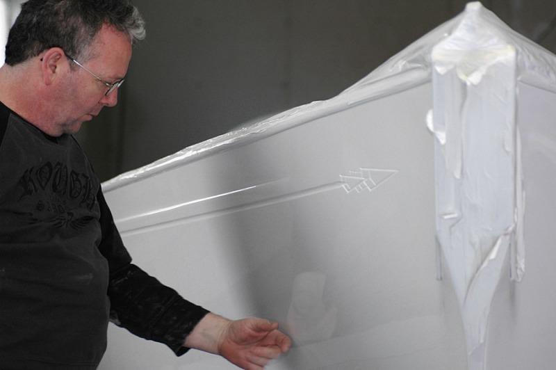 Anschließend wird die Lackierung einer genauen Inspektion unterzogen. Meister Heede bei der Überprüfung der Lackschicht.