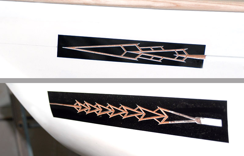 Die bei der Greta kaum mehr erkennbaren Konturen der prägnanten Zier-Pfeile, das Markenzeichen der Abeking & Rasmussen Yachten an Bug und Heck, mussten nachgeschnitzt werden und warten nun auf eine Blattvergoldung.